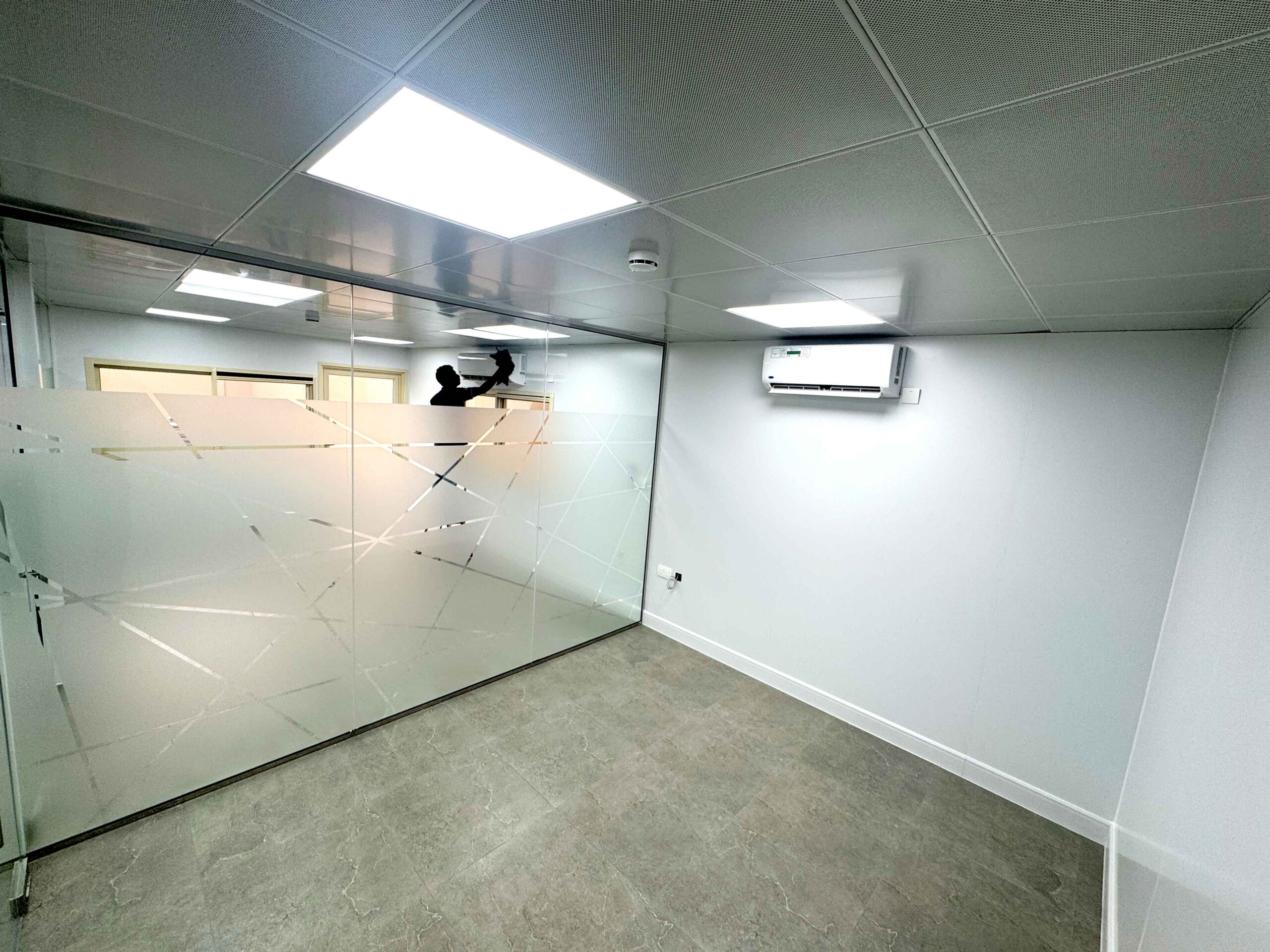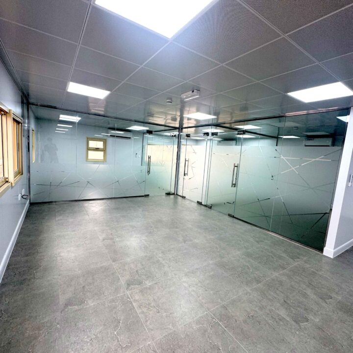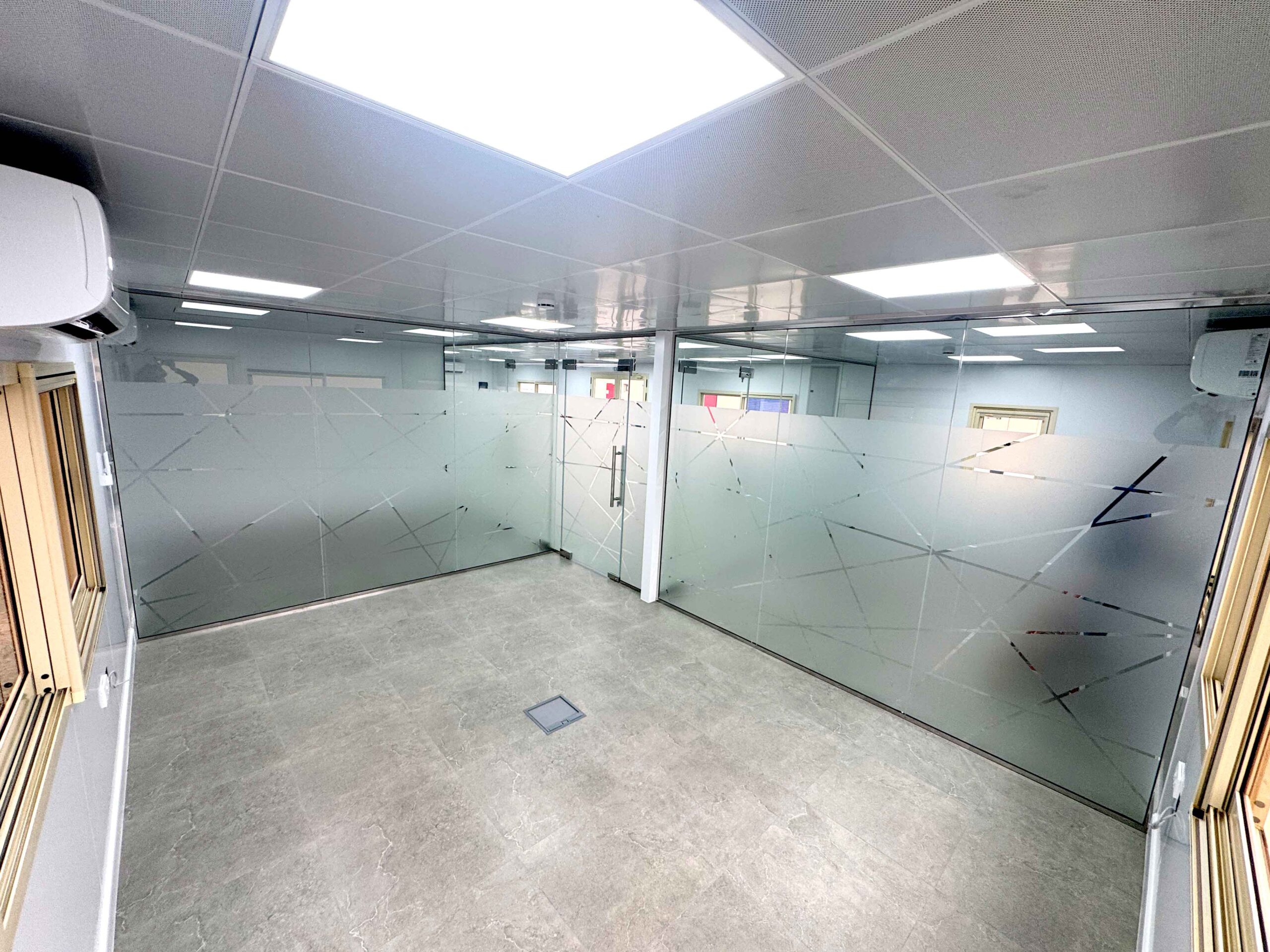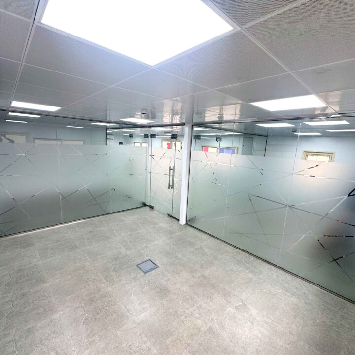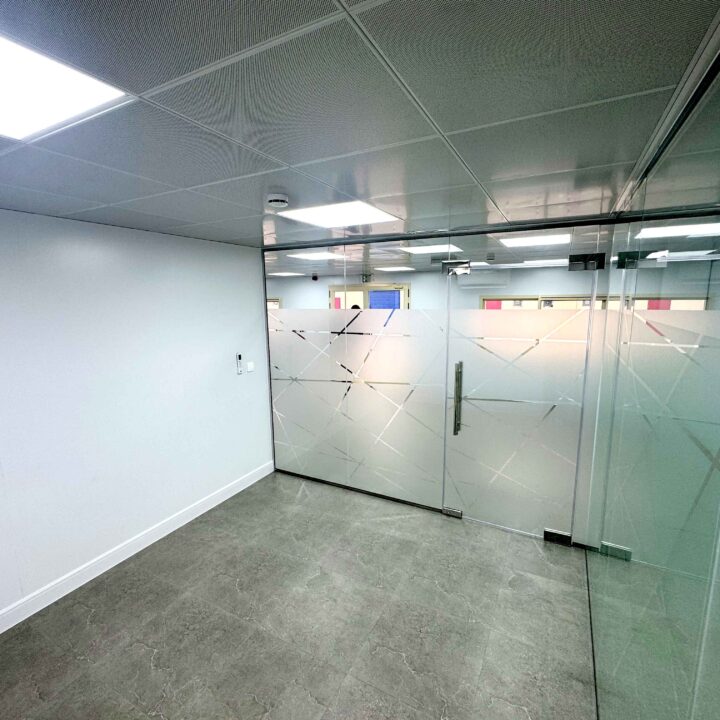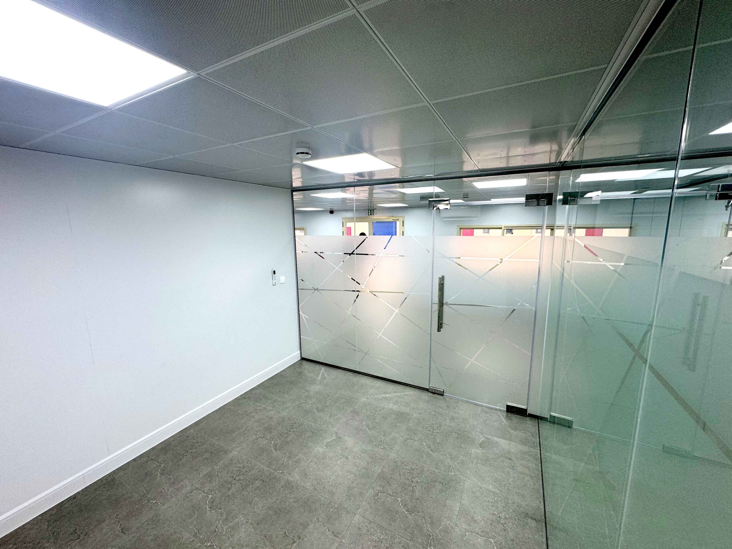 10mm single-glazed glass partitions, offering a contemporary office look while maintaining visibility and natural light flow. - Doors: