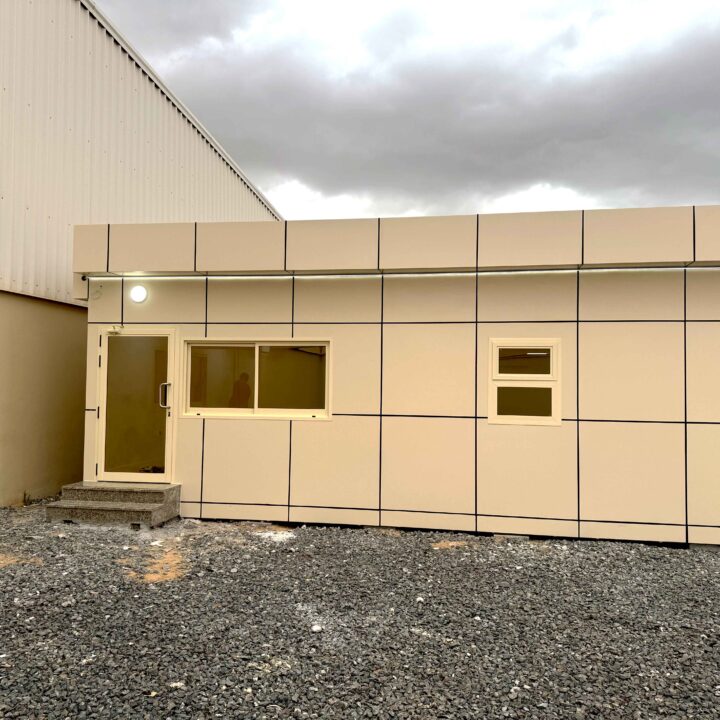 Internal and external walls constructed with aluminium composite panels (ACP), providing excellent insulation, weather resistance, and a clean, modern finish.